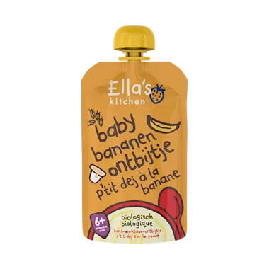 Ingrediënten: 56% bananen*, 41% yoghurt (MELK)*, 2% HAVERbloem*, 1% rijstebloem*, een beetje geconcentreerd citroensap*,