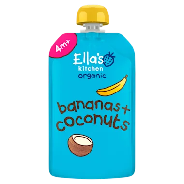 Babyvoeding. 100% biologische gepureerde bananen + kokosnoten.