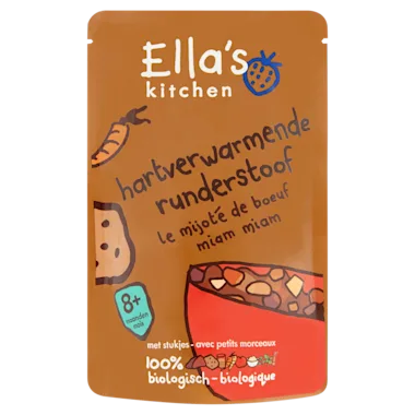 Ingrediënten: 26% aardappelen*, 25% wortelen*, 22% groentebouillon (water en groenten*, wortelen*, uien*, pastinaken*), 10% rundvlees*, 6% tomaten*, 6% pastinaken*, 4% uien*, 2% maiszetmeel*, <lt/>1% gemengde kruiden (peterselie*, tijm*, kruidnagel*, rozemarijn*), <lt/>1% zwarte peper*, *= biologisch.