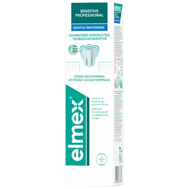 elmex® Sensitive Professional Gentle White tandpasta creëert een langdurige beschermende barrière tegen gevoeligheid. De tandpasta voor gevoelige tanden helpt ook om de natuurlijke witte kleur van de tanden te herstellen.