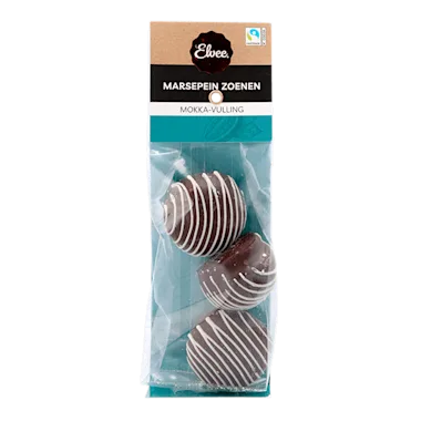 Crèmevulling met mokkasmaak, omhuld met amandelmarsepein, pure chocolade en witte chocolade decoratie.