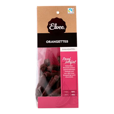 Ingrediënten: 40% gekonfijte sinaasappelschil, suiker, cacaomassa, glucose-fructosestroop, cacaoboter, zuurteregelaar (citroenzuur), emulgator (SOJALECITHINE), natuurlijk vanille-aroma. Gemaakt in een bedrijf waar ook gluten bevattende granen, ei en noten worden verwerkt.