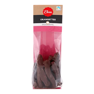 Ingrediënten: 40% gekonfijte sinaasappelschil, suiker, cacaomassa, glucose-fructosestroop, cacaoboter, zuurteregelaar (citroenzuur), emulgator (SOJALECITHINE), natuurlijk vanille-aroma. Gemaakt in een bedrijf waar ook gluten bevattende granen, ei en noten worden verwerkt.