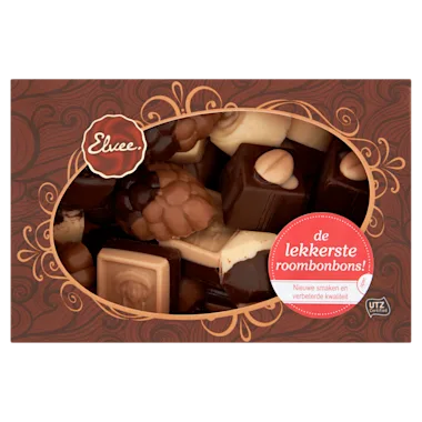 Grote Nederlandse bonbons van melk, pure en witte chocolade met een zachte roomvulling en smaken als hazelnoot praline, karamel, aardbei, kers , mokka, en kaneel