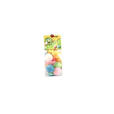 Ingrediënten: suiker, maïszetmeel, water, dextrose, voedingszuur (E334), zuurteregelaar (E500), aroma’s, kleurstoffen (E162, E100, E132).