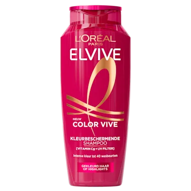 L'Oréal Paris Elvive Color Vive Shampoo is een shampoo die speciaal ontwikkeld is om de kleur van gekleurd haar of highlights te beschermen. De nieuwe formule is verrijkt met een combinatie van pure Vitamine Cg**** en UV-filters om het haar grondig te reinigen en te verzorgen. Het haar wordt op die manier doeltreffend beschermd, met als resultaat gekleurd haar dat langer een stralende kleur en prachtige glans behoudt. De nieuwe duurzame verpakking van L'Oréal Paris Elvive Color Vive Shampoo is nu verkrijgbaar in het standaard 250ml formaat*. De UV-filters die deze formule bevat bieden extra bescherming tegen externe schadelijke factoren zoals zonlicht. Zo helpt de L'Oréal Paris Elvive Color Vive Shampoo kleurvervaging te voorkomen door de intensiteit van de kleur tot wel 40 wasbeurten te garanderen***. De nieuwe verpakking bevat 20% minder plastic*. *Vergeleken met de vorige fles, de hoeveelheid plastic hangt af van de grootte van het formaat. **Behalve de kleurstoffen, toevoegingen en etiketten. ***Instrumentele test shampoo + conditioner. ****Vitamine C-derivaat.