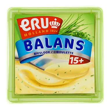 ERU Balans Bieslook is een heerlijk magere 15+ smeerbare kaas, gemaakt van Gouse kazen met een vleugje yoghurt en stukjes bieslook. ERU Balans bevat 5% vet en past daarmee perfect in een gezond leef- en voedingspatroon. Daarnaast bevat ERU Balans 75% minder vet en 34,5% minder natrium dan soortgelijke smeerbare kazen. Ideaal voor op een boterham, maar ook heerlijk op een cracker, toastje of wrap.