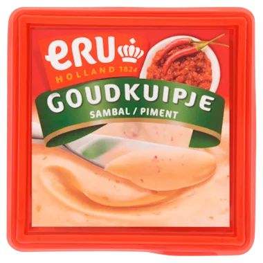 ERU Goudkuipje Sambal is een pittige smeerbare kaas met sambal en gemaakt van Goudse kazen. Ideaal op een boterham, maar ook heerlijk op een cracker met plakjes komkommer.