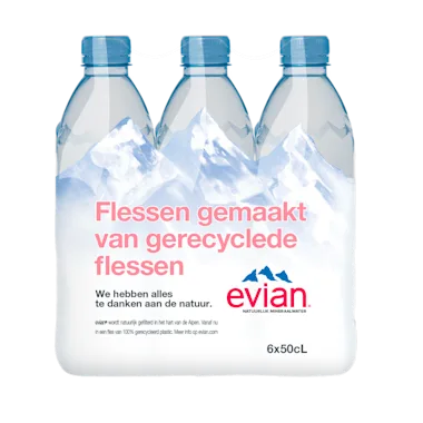 evian bevat natuurlijk mineralenMineraalwater uit de Franse Alpen direct van de bronDe flessen van evian worden gemaakt van 100% gerecycled plastic, rPETBij uitstek geschikt voor tijdens het sporten met de sportdop