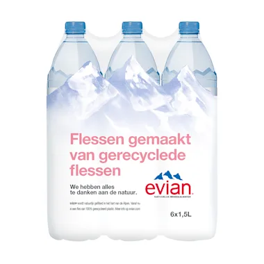 evian bevat natuurlijk mineralenMineraalwater uit de Franse Alpen direct van de bronDe flessen van evian worden gemaakt van 100% gerecycled plastic, rPETBij uitstek geschikt voor moeders en baby's