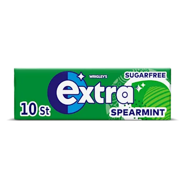 EXTRA Spearmint: Suikervrije kauwgom boordevol de aromatische smaak van groene munt, voor een heerlijk mintfris gevoel. Knapperig van buiten en chewy van binnen, met een smaak die lang blijft hangen. Deze verpakking EXTRA kauwgom in de smaak spearmint bevat 10 kauwgoms.