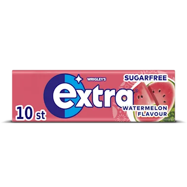 EXTRA Watermelon: Suikervrije kauwgom die barst van een heerlijke fruitige smaak van watermeloen. Knapperig van buiten en chewy van binnen, met een smaak die lang blijft hangen. Deze verpakking EXTRA kauwgom in de smaak watermelon bevat 10 kauwgoms.
