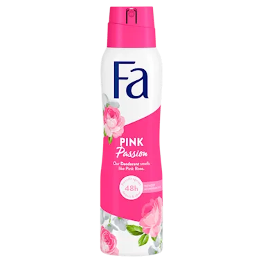 Ontdek Fa Pink Passion deodorant spray met de geur van roze rozen. De vegan formule biedt 48 uur bescherming tegen nare geurtjes en is vrij van aluminiumzouten. De verpakking bevat 25% recycled aluminium.