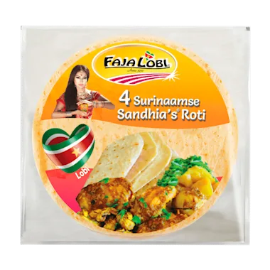af en toe omscheppen, 15 minuten op matigvuur laten sudderen. Sandhia’s Roti opwarmenvolgens bereidingswijze op de verpakking.