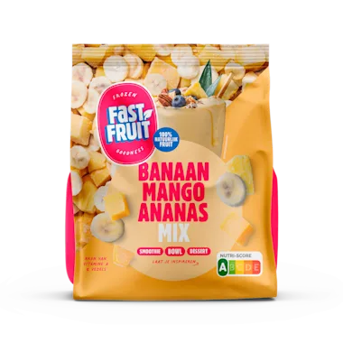 Varieer eventueel zelf met de verhoudingen voor jouw gewenste dikte. Voeg je favoriete toppings toe en geniet. BANAAN MANGO ANANAS SMOOTHIE 1 persoon: 150 g Fast Fruit Mix Banaan Mango Ananas, 150 g Griekse yoghurt, 50 ml (verse) sinasappelsap, 20 g granola, 5 blauwe bessen, 2 el pecannoten, 1tl zadenmix. Doe de mix in de blender met de Griekse yoghurt en het sap. Blend tot een gladde drinkbare smoothie. Voeg eventueel een scheutje water toe indien het moeizaam gaat. Schenk de smoothie in een glas en top af met de granola, blauwe bessen, pecannoten en zadenmix. Geniet!