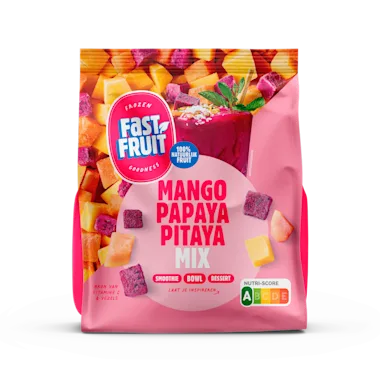Varieer eventueel zelf met de verhoudingen voor jouw gewenste dikte. Voeg je favoriete toppings toe en geniet. MANGO PAPAYA PITAYA SMOOTHIE 1 persoon: 150 g Fast Fruit Mix, Mango Papaya Pitaya, 200 ml kokoswater, 1 el kokosrasp, 1 el gehakte pistachenoten, 2 el amandelen, 1 klein handje verse muntblaadjes. Doe de mix in de blender met kokoswater. Blend tot een gladde drinkbare smoothie. Schenk de smoothie in een glas en top af met kokosrasp, pistachenoten en amandelen. Garneer het met wat verse blaadjes munt. Smakkelijk!