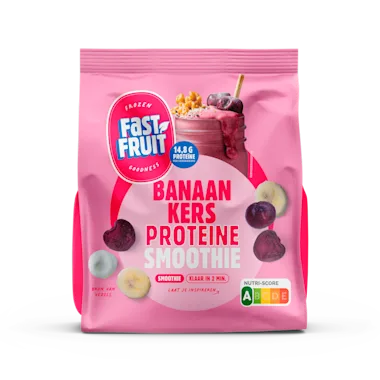 Varieer eventueel zelf met de verhoudingen voor jouw gewenste dikte. Voeg je favoriete toppings te en geniet. BANAAN KERS PROTEÏNE SMOOTHIE 1 persoon: 150 g Fast Fruit Banaan Kers Proteïne Smoothie, 150 g magere kwark, 50 ml appelsap, 1 tl hennepzaad, 2 el walnoten. Doe de Smoothie-mix in de blender met de magere kwark en het sap. Blend tot een gladde drinkbare smoothie. Schenk de smoothie in een glas en top af met hennepzaad en walnoten. Voeg eventueel nog los 2 kersen uit de mix toe. Heerlijk!