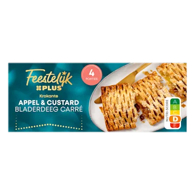 Krokante appel & custard bladerdeeg carré gevuld met stukjes appel en custardpudding om thuis af te bakken.