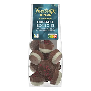 Melkchocolade gevuld met 27% pure chocolade ganache, 8% witte chocolade, 36% decoratie met pure chocoladesmaak en 2% gevriesdroogde framboos