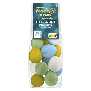 Melkchocolade-eitjes gevuld met 46% hazelnootpraliné omhuld met 16% suikerlaagje