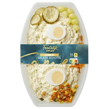 Ingrediënten :43% Aardappel, water, plantaardige oliën (raapzaad, zonnebloem), 6% VRIJE-UITLOOPEI*, augurk, azijn, suiker, 2,5% SCHARRELEI, wortel, zilverui (zilverui, antioxidant: E223 (SULFIET)), maïszetmeel, ui, zout, maïs, 0,5% SCHARRELKIPPENEI-EIGEEL, gemodificeerd zetmeel (maïs, aardappel), gedroogde groenten (wortel, pastinaak, ui, tomaat, paprika), conserveermiddel: E202/E211, kruiden, dextrose, specerijen (o.a. MOSTERDZAAD), gehydrolyseerde plantaardige eiwitten (SOJA, maïs), aroma's (SOJA, MOSTERD), verdikkingsmiddel: xanthaangom, glucosestroop, voedingszuur: E270/E330, zuurteregelaar: E325, antioxidant: E300/E330, kleurstof: E101/E160a, natuurlijk aroma, SOJABONENPOEDER, TARWEKORREL, dille-extract, knoflook-extract, maltodextrine, gistextract.
