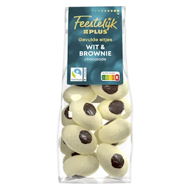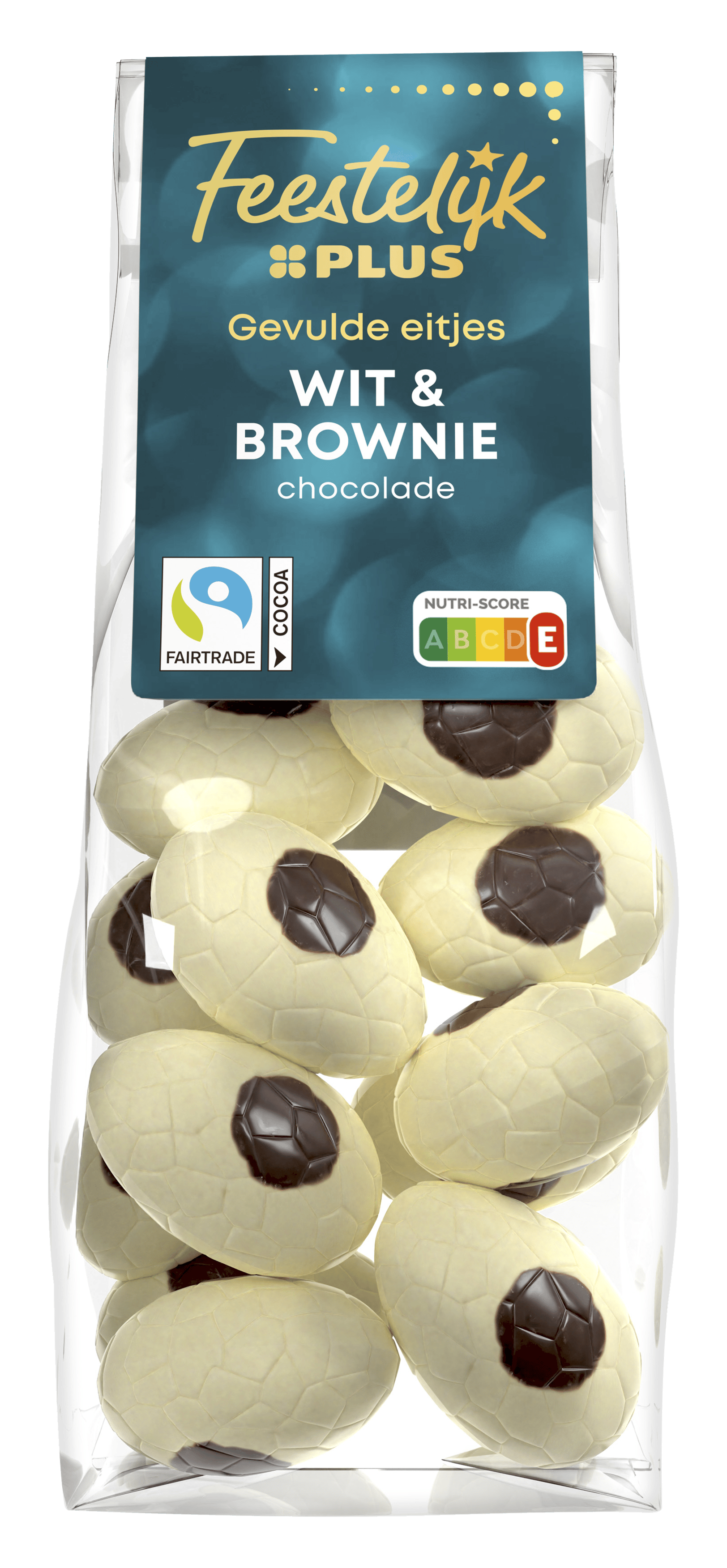Witte chocolade-eitjes met pure chocoladedecoratie en 37% vulling met vanille- en browniesmaak