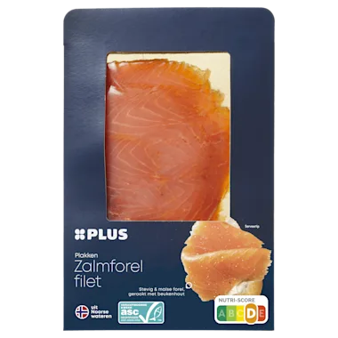 97% Regenboogforel* (VIS), zout, conserveermiddel: E267, suiker, rook. *Regenboogforel (Oncorhynchus mykiss), gekweekt in Noorwegen. Kweekmethode: kooien in zee. E= door EU goedgekeurde hulpstof.