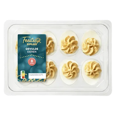 Ingrediënten :67% SCHARRELKIPPENEI-EIWIT (SCHARRELKIPPENEI-EIWIT, zout, water, conserveermiddel: E270/E325/E202/E211, voedingszuur: E260), 33% vulling (SCHARRELKIPPENEI-EIGEEL, raapzaadolie, water, suiker, specerijen, MOSTERDZAAD, zout, azijn, 0,3% bieslook, gemodificeerd maiszetmeel, tomatenpoeder, MELKEIWIT, lactose (MELK), maltodextrine, rode bietensapconcentraat, extract van paprika, gistextract, voedingszuur: E330, verdikkingsmiddel: E410/E412/E415, conserveermiddel: E202/E211/E270/E325, antioxidant: E224).