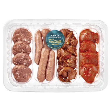 25% Kipburger (93% kippenvlees*, specerijenextracten, inulinevezel, citrusvezel, zout, tomatenpoeder, specerijen, aroma, ui), 25% kipchipolata (90% kippenvlees*, specerijenextracten, water, rijstbloem, aardappelzetmeel, zout, schapendarm, glucosestroop, natuurlijk aroma), 25% kipdijfiletreepjes met paprika (78% kipdijfilet*, 16% paprika, marinade (specerijen (komijn, koriander, venkelzaad, peper, paprika, kurkuma, foelie, kruidnagel, fenegriek, gember, karwijzaad, piment, chili, knoflook), zout, maltodextrine, lavasblad, koolzaadolie, specerijenextracten, zonnebloemolie), 25% kipfiletlapje (90% kipfilet*, raapolie, uienextract, specerijen, zout, gehydrolyseerd SOJA-EWIT, paprikagranulaat, maltodextrine, paprikaconcentraat, suiker, natuurlijk peperaroma, verdikkingsmiddel: E464/E412, gistextract, antioxidant: E300, voedingszuur: citroenzuur).