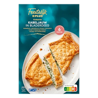 46% Bladerdeeg (TARWEBLOEM, margarine (palmolie, palmvet, water, zout, emulgator: E471, zuurteregelaar: citroenzuur), water, zout, SCHARRELEI), 21% kabeljauw* (VIS), 12% spinazie, 6% kaas (MELK, zout, zuursel, stremsel), water, crème fraîche (room (MELK), zuursel), TARWEBLOEM, uien, gemodificeerd aardappelzetmeel, magere MELKPOEDER, boter (MELK), 0,3% geconcentreerd citroensap, witte wijn, zout, peper.