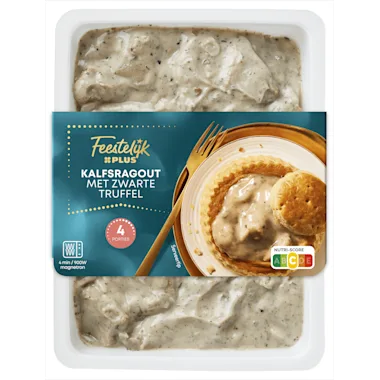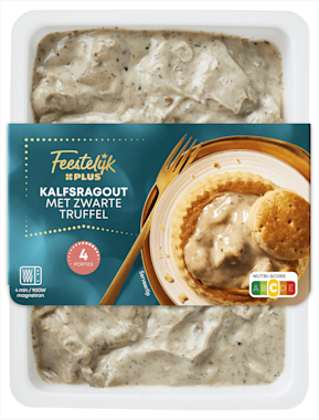 36% Kalfsvlees, room (MELK), water, champignon, ui, zonnebloemolie, gemodificeerd maïszetmeel, TARWEZETMEEL (glutenvrij), voedingszuur: E326/E262/E270, zout, aroma, 0,3% zwarte zomertruffel, verdikkingsmiddel: guarpitmeel, MELKEIWITTEN, specerijen, KARNEMELKPOEDER, kruiden, kaliumzout, emulgator: E472b/E471, stabilisator: E460/E407, zuurteregelaar: E575, gedroogde groenten (prei, ui).