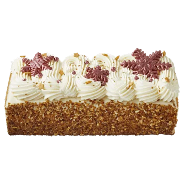 Cakelagen met 7% frambozen-bessenmousse, 30% witte topping en 11% nougatine, gedecoreerd met 31% slagroom en 2,5% suikerdecoratie