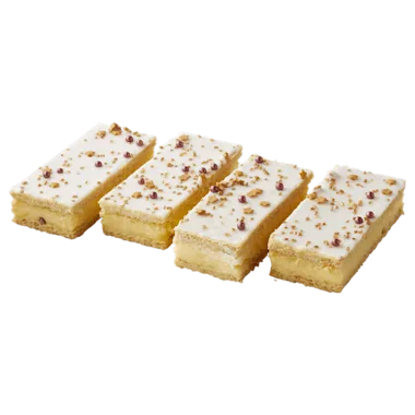 Twee bladerdeegplakjes gevuld met 55% banketbakkersroom, gedecoreerd met 15% witte fondant en gekleurde suikerdecoratie