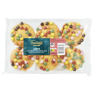 Ingrediënten :suiker, TARWEBLOEM, SCHARRELKIPPENEI, plantaardige vetten (palm, kokos), 11% suiker gecoate melkchocolade dragees (suiker, cacaomassa, cacaoboter, volle MELKPOEDER, rijstzetmeel, concentraten (druivensap, radijssap, zwartebessensap, citroensap, algen), emulgator: E322, glansmiddel: E414/E903/E901,saffloer extract, water, 10% gele fondant (suiker, plantaardige vetten (palmpit, palm), emulgator: E322(SOJA), kurkuma-extract, kleurstof: E160b(i)), raapzaadolie, aardappelzetmeel, roomboter (MELK), rijsmiddel: E450/E500, stabilisator: sorbitolen, emulgator: E471/E475, dextrose, zout, conserveermiddel: E200/E282, rijstebloem, natuurlijke aroma's, verdikkingsmiddel: xanthaangom, citroenrasp, zuurteregelaar: citroenzuur, gemodificeerd aardappelzetmeel.