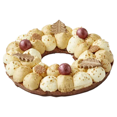 Schuimkrans opgespoten met 78% bavarois met vanille- en karamelsmaak, gedecoreerd met 6% suiker- en cacaodecoratie