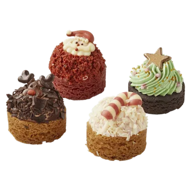 Mini amandelslofbodems gevuld met bavaroise met roomkaas-, pistache-, chocolade- en aardbeiensmaak