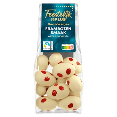 Witte chocolade-eitjes met vulling met frambozensmaak en gekleurde cacaodecoratie.