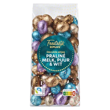 Pure, witte en melkchocolade-eitjes met hazelnootvulling