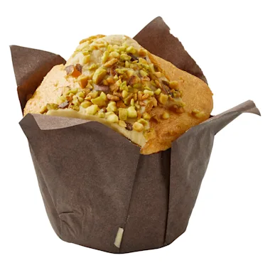 Muffin met 18% pistachevulling, 5% coating en 2,8% pistachetopping, ontdooid.