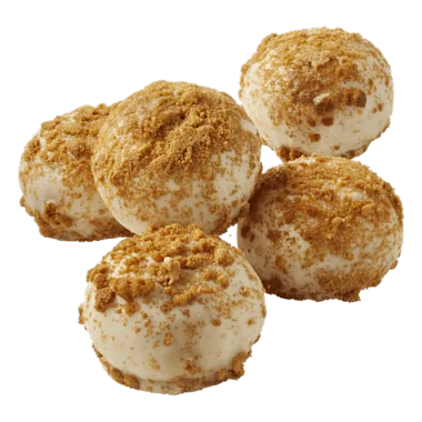 Gefrituurde deegwaren met 16% vulling met speculoossmaak, 27% coating en 8% topping, ontdooid