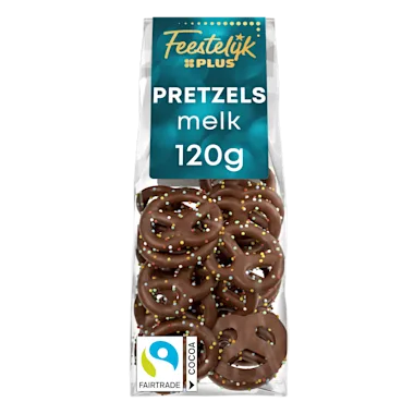 Pretzel omhuld met 51% melkchocolade en gedecoreerd met 22% gekleurde suikerdecoratie