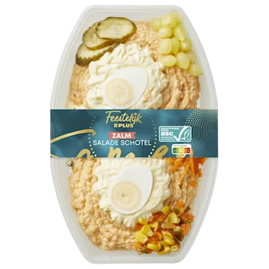 Ingrediënten :Aardappel, water, plantaardige oliën (raapzaad, zonnebloem), 8% gekookte zalm* (VIS), augurk, azijn, suiker, zilverui (zilverui, antioxidant: E223 (SULFIET)), SCHARRELEI, wortel, tomatenpuree, maïszetmeel, zout, maïs, gemodificeerd zetmeel (maïs, aardappel), glucose-fructosestroop, SCHARRELKIPPENEI-EIGEEL, gedroogde appel (SULFIET), conserveermiddel: E202/E211, gedroogde groenten (wortel, pastinaak, tomaat, paprika, ui), VISPOEDER (zalm (VIS), kabeljauw (VIS)), specerijen (o.a. MOSTERDZAAD), kleurstof: E101/E160a/E160c, gehydrolyseerde plantaardige eiwitten (SOJA, maïs), kruiden, ui, maltodextrine, glucosestroop, gistextract, natuurlijk aroma, voedingszuur: E270/E330, aroma's (MOSTERD, SOJA), antioxidant: E300/E330/E392, verdikkingsmiddel: xanthaangom, rookaroma, ui-extract, zuurteregelaar: E325, SOJABONENPOEDER, rook, dille-extract, knoflook-extract, TARWEKORREL, dextrose.