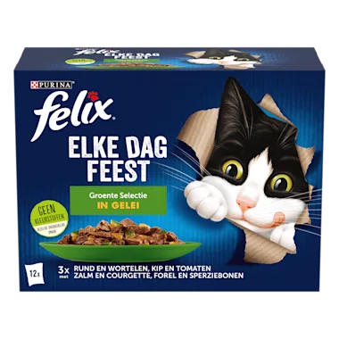 FELIX® Elke Dag Feest met groenten is een assortiment onweerstaanbare maaltijden kattenvoer die er zó lekker uitzien, zó lekker ruiken en zó lekker smaken alsof je het zelf hebt klaargemaakt! Speciaal bereid met zachte stukjes in een overheerlijke gelei. Jouw deugniet zal elke keer weer genieten van een onweerstaanbare maaltijd natvoer. Deze heerlijke maaltijden vormen ook een bron van essentiële Omega 6-vetzuren met de juiste combinatie van uitgebalanceerde vitaminen die jouw kat energie zullen geven en klaar zullen maken om nog meer kattenkwaad uit te halen. Ze zitten vol gezonde ingrediënten om 100% te voldoen aan de behoeften van jouw kat indien gevoed volgens de voedingsrichtlijnen op de verpakking. Dat is nog niet alles! FELIX Elke Dag Feest is er in een ruime keuze aan onweerstaanbare recepten in overheerlijke gelei om jouw kat de variatie te bieden waar hij zo van houdt. Het smaakt echt zo goed als het eruitziet! Felix – gewoonweg onweerstaanbaar!
