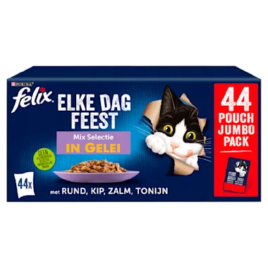 FELIX Elke Dag Feest is een assortiment onweerstaanbare maaltijden die er zó lekker uitzien en zó lekker ruiken alsof je het zelf hebt klaargemaakt. Elk recept, gemaakt met kwalitatief hoogwaardige ingrediënten, heeft malse stukjes in gelei voor een smakelijke maaltijd waar je kat dol op zal zijn! Ze zijn ook een bron van omega-6-vetzuren met de juiste combinatie van vitamines om je kat vol energie te houden en klaar te maken voor kattenkwaad! Ze zitten boordevol gezonde ingrediënten om 100% te voldoen aan de dagelijkse behoeften van jouw kat indien gevoed volgens de voedingsrichtlijnen op de verpakking.Dat is nog niet alles! FELIX Elke Dag Feest biedt een ruime keuze aan onweerstaanbare recepten in overheerlijke gelei om jouw kat de variatie te bieden waar hij zó van houdt.Hiermee is het echt Elke Dag Feest!FELIX - Gewoonweg onweerstaanbaar!FELIX Elke Dag Feest is een assortiment onweerstaanbare maaltijden die er zó lekker uitzien en zó lekker ruiken alsof je het zelf hebt klaargemaakt. Elk recept, gemaakt met ingrediënten van hoge kwaliteit, heeft malse stukjes in gelei voor een smakelijke maaltijd waar je kat dol op zal zijn! Ze zijn ook een bron van Omega 6-vetzuren met de juiste combinatie van vitamines om je kat vol energie te houden en klaar te maken voor kattenkwaad! Ze zitten boordevol gezonde ingrediënten om 100% te voldoen aan de dagelijkse behoeften van jouw kat indien gevoed volgens de voedingsrichtlijnen op de verpakking. En dat is nog niet alles! FELIX Elke Dag Feest is er in een ruime keuze aan onweerstaanbare recepten in overheerlijke gelei om jouw kat de variatie te bieden waar hij zó van houdt. Hiermee is het echt Elke Dag Feest!FELIX - Gewoonweg onweerstaanbaar!FELIX Elke Dag Feest is een assortiment onweerstaanbare maaltijden die er zó lekker uitzien en zó lekker ruiken alsof je het zelf hebt klaargemaakt. Elk recept, gemaakt met ingrediënten van hoge kwaliteit, heeft malse stukjes in gelei voor een smakelijke maaltijd waar je kat dol op zal zijn! Ze zijn ook een bron van Omega 6-vetzuren met de juiste combinatie van vitamines om je kat vol energie te houden en klaar te maken voor kattenkwaad! Ze zitten boordevol gezonde ingrediënten om 100% te voldoen aan de dagelijkse behoeften van jouw kat indien gevoed volgens de voedingsrichtlijnen op de verpakking. Dat is nog niet alles! FELIX Elke Dag Feest is er in een ruime keuze aan onweerstaanbare recepten in overheerlijke gelei om jouw kat de variatie te bieden waar hij zó van houdt. Hiermee is het echt Elke Dag Feest!FELIX - Gewoonweg onweerstaanbaar!FELIX Elke Dag Feest is een assortiment onweerstaanbare maaltijden die er zó lekker uitzien, zó lekker ruiken en zó lekker smaken alsof je het zelf hebt klaargemaakt!Elk recept, gemaakt met ingrediënten van hoge kwaliteit, bevat malse stukjes in gelei voor een smakelijke maaltijd waar je kat dol op zal zijn! Ze zijn ook een bron van omega-6-vetzuren met de juiste combinatie van vitamines om je kat vol energie te houden en klaar te maken voor kattenkwaad! Ze zitten boordevol gezonde ingrediënten om 100% te voldoen aan de dagelijkse behoeften van jouw kat indien gevoed volgens de voedingsrichtlijnen op de verpakking. Dat is nog niet alles! FELIX Elke Dag Feest is er in een ruime keuze aan onweerstaanbare recepten in overheerlijke gelei om jouw kat de variatie te bieden waar hij zó van houdt. Hiermee is het echt Elke Dag Feest!FELIX - Gewoonweg onweerstaanbaar!