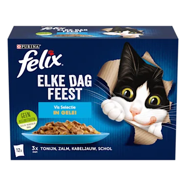 FELIX® Elke Dag Feest Vis Selectie is een assortiment onweerstaanbare maaltijden kattenvoer die er zó lekker uitzien, zó lekker ruiken en zó lekker smaken alsof je het zelf hebt klaargemaakt! Speciaal bereid met zachte stukjes in een overheerlijke gelei. Jouw deugniet zal elke keer weer genieten van een onweerstaanbare maaltijd. Deze heerlijke maaltijden natvoer vormen ook een bron van essentiële omega 6-vetzuren met de juiste combinatie van uitgebalanceerde vitaminen die jouw kat energie zullen geven en klaar zullen maken om nog meer kattenkwaad uit te halen. Ze zitten vol gezonde ingrediënten om 100% te voldoen aan de behoeften van jouw kat indien gevoed volgens de voedingsrichtlijnen op de verpakking. FELIX - gewoonweg onweerstaanbaar!