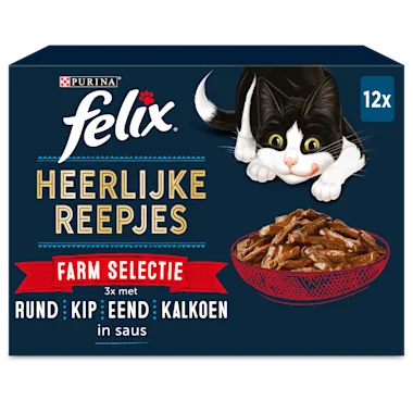 Felix Heerlijke Reepjes zijn malse en onweerstaanbare reepjes in een smakelijke jus waar jouw kat dol op zal zijn! Ze zien, ruiken en smaken heerlijk, net alsof je het zelf hebt klaargemaakt! Wanneer je jouw kat Felix Heerlijke Reepjes voert, weet je dat je hem iets geeft waar hij echt van houdt. Elk recept wordt precies op de juiste temperatuur bereid voordat het in malse reepjes wordt gesneden en in een onweerstaanbare saus wordt geserveerd. Ze vormen ook een bron van essentiele omega 6 vetzuren met de juiste combinatie van uitgebalanceerde vitaminen die jouw kat klaar zullen maken om nog meer kattenkwaad uit te halen. Ze zitten vol gezonde ingredienten om 100% te voldoen aan de dagelijkse behoeften van jouw kat indien gevoed volgens de voedingsrichtlijnen op de verpakking.