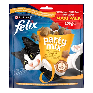 FELIX® Party Mix Original met Kip-, Lever- en Kalkoensmaak bevat een onweerstaanbare mix van snacks vol van verleidelijke aroma’s, heerlijke smaken en aantrekkelijke texturen.