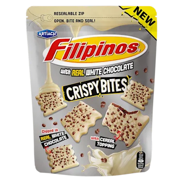 Krokante koekjes gedipt in 100% echte witte chocolade (52%) en met chocoladegraan-toppings