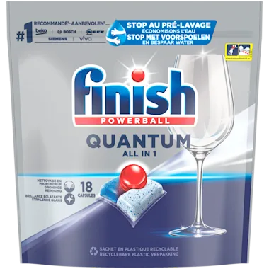 Met Finish Quantum All in 1 vaatwastabletten krijg je bij elke wasbeurt vanaf de eerste keer een diepe reiniging en een stralende glans! De capsuletechnologie met drie compartimenten verwijdert alle soorten voedselresten - zonder dat je je vaat hoeft voor te spoelen. Het poeder en de gel werken om residu los te maken en te verwijderen. De Powerball beschermt het glas en helpt de glans van je servies te behouden. Dit alles met 25% minder chemicaliën dan onze klassieke Finish compacte poedertabletten**.