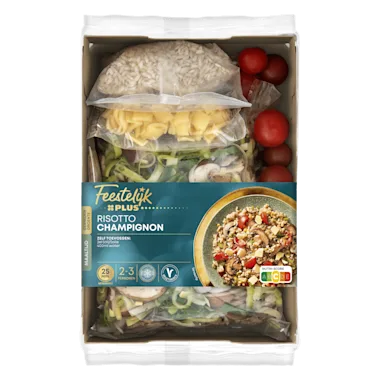 Ingrediënten :24% kastanjechampignons, 21% risottorijst, 18% prei, 12% ui, 11% cherrytomaat, 10% kaas (MELK), peterselie, 1,4% paddenstoelenbouillonpoeder (zout, gistextract, natuurlijke aroma's, champignonpoeder, eekhoorntjesbroodpoeder, preipoeder, kruiden (peterselie, tijm)).